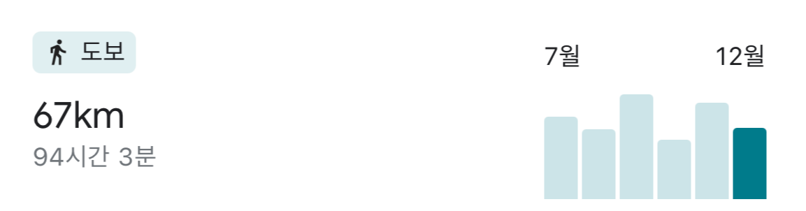 지난번 포스팅에서도 썼지만 11월 도보 거리가 왜 저리 많이 나왔는지 미스터리다. 이 정도면 평균이라고 할 만하다.